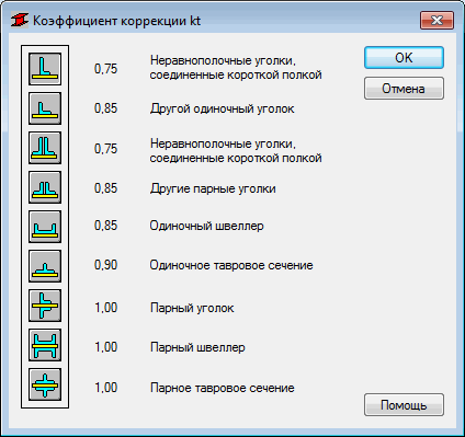 Эту опцию используют для определения величины поправочного коэффициента kt. Он учитывается при расчете прочности элемента на растяжение, согласно разделу норм 7.2. Можно выбрать одну из опций в этом диалоговом окне, они совпадают со значениями коэффициентов в таблице норм 7.3.2.