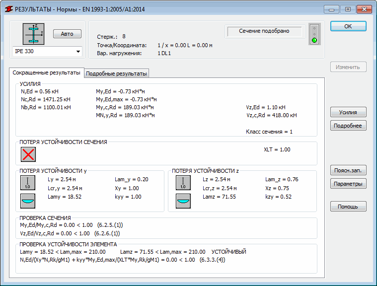 Прим.: Нормативные параметры вычисляются в соответствии с данными, отображаемыми в верхней части диалогового окна, например, номером стержня, точками и группами, и параметрами выбранного сечения.