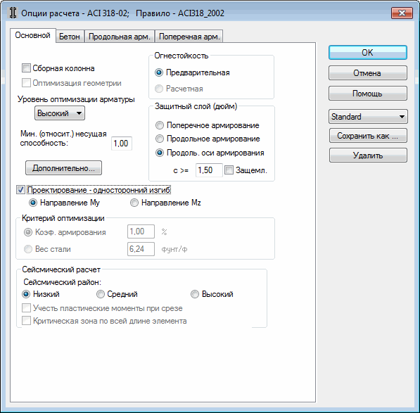Если диалоговое окно "Опции расчета" относится к расчету ж/б балок, то содержание вкладки "Основные" будет зависеть от выбора жб норм. Для каждой нормы в этом диалоговом окне могут быть определены следующие параметры: