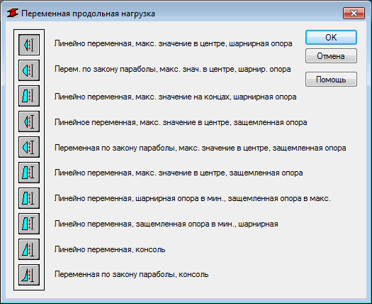 Эта опция используется для определения модели опоры и типа изменения осевых сил, действующих на рассчитываемый стальной элемент. Предлагаемые модели соответствуют нагружениям, описанным в пункте 6.3.2.2 SE-A. В зависимости от выбранной модели, расчетная длина элемента Lk рассчитывается автоматически с учетом соотношения мин./макс. осевых сил, действующих в рассчитываемом варианте нагружения. Для того чтобы эта опция стала доступной, нажимают на кнопку Переменная осевая нагрузка, расположенную в диалоговом окне Графики потери устойчивости.
