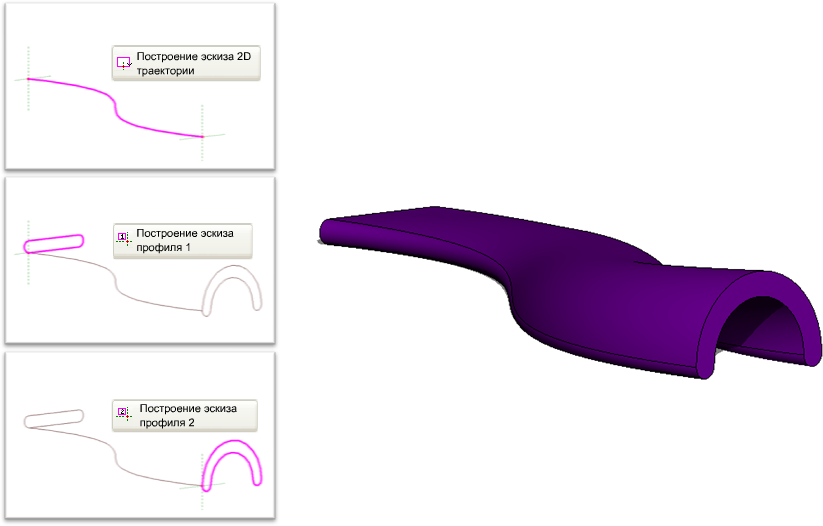 Инструмент «Переход по траектории» позволяет создать комбинацию 2 разных профилей путем сдвига вдоль некоторой траектории. Форма перехода по траектории определяется построенной или выбранной 2D траекторией и 2 построенными или загруженными профилями.