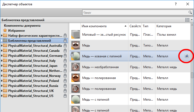 - В Диспетчере объектов выберите набор характеристик, который требуется добавить к материалу.