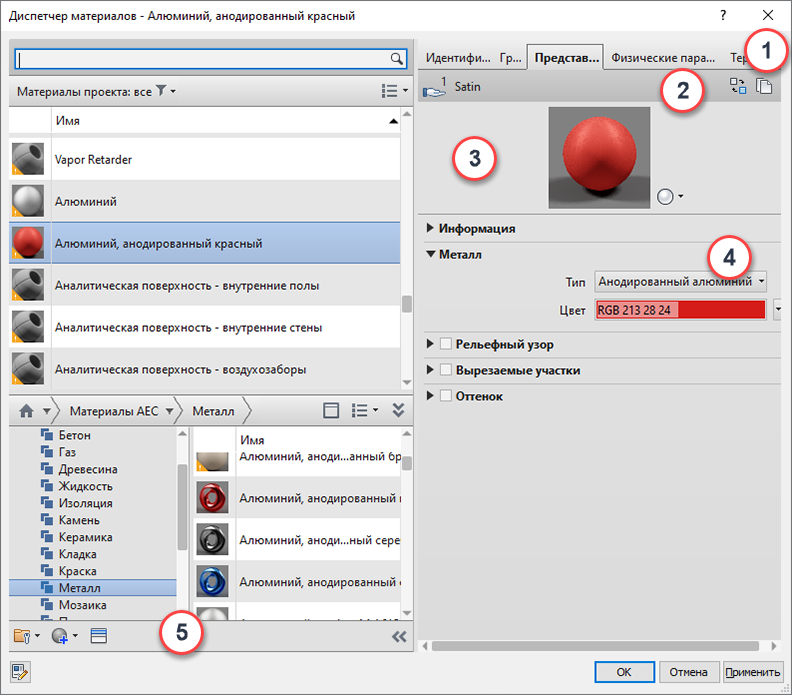 4 | Панель "Свойства": отображение и управление дополнительными свойствами выбранного набора характеристик. Имя и описание набора характеристик отображаются под раскрывающейся панелью "Информация". В приведенном выше примере показаны свойства металла, отображаемые (развернутые) для набора характеристик внешнего вида "Анодированный — красный". Например, набор свойств, который отображается для жидкостей, отличается от набора свойств для металла. |