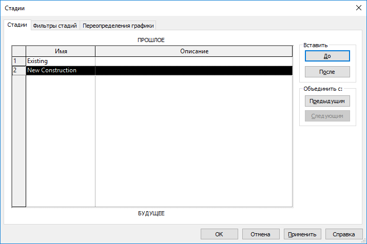 Откроется диалоговое окно "Стадии" с открытой вкладкой "Стадии". По умолчанию каждый проект имеет стадии "Новая конструкция" и "Существующие".