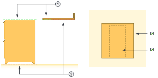 На рисунке показаны семейство шкафов и семейство прилавков. Пусть требуется поместить прилавок поверх шкафа и отобразить это на виде в плане. Для обоих семейств предусмотрены области маскировки (показанные красными штриховыми линиями