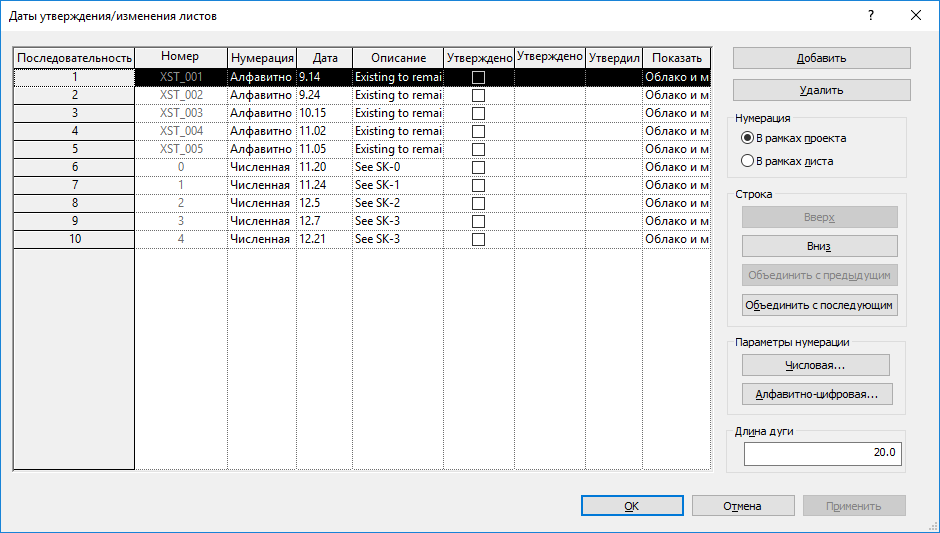 Можно начать проект с использованием одной схемы нумерации (например, численной). Позднее эту схему можно изменить на другую для указания на другой этап проекта. Порядковый номер, указанный в диалоговом окне «Даты утверждения/изменения листов», сохраняется для всех изменений в рамках проекта независимо от отдельных схем нумерации.
