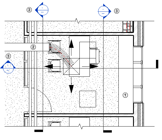 Ниже приведены примеры, основанные на модели, в которой следующий элемент является плоскостью разреза уровня 1. Зеленая стрелка на плоскости разреза обозначает полный секущий диапазон соответствующих видов в плане. Синяя стрелка обозначает основной секущий диапазон, расположенный выше потолка в камере и ниже уровня 1. Оранжевая стрелка обозначает глубину проецирования. (См. раздел Секущий диапазон.) Для видов в плане, приведенных ниже в качестве примера, задан высокий уровень детализации, с помощью чего в целях наглядности повышается качество отображения механизмов, электрооборудования и трубопроводов.