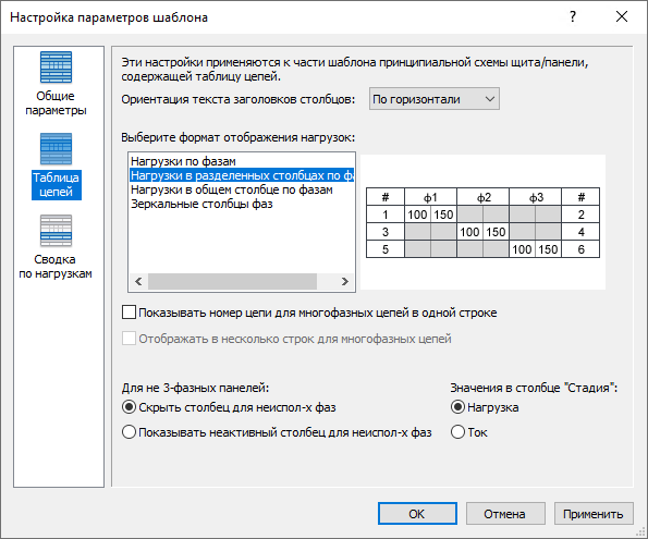 - Укажите, следует ли показывать значения столбца фаз в нагрузках (ВА) или токе (А).