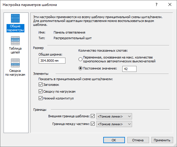 Имеется возможность адаптации внешнего вида принципиальных схем щита/панели. Можно задать общие параметры внешнего вида, а также параметры для информации о цепях и сводки о нагрузках.