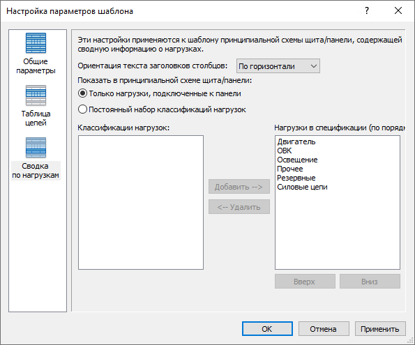 - В области "Показать в спецификации панели" задайте, требуется ли отображать только подключенные к панели нагрузки или постоянный набор нагрузок. Если выбран постоянный набор, задайте отображаемые нагрузки с помощью кнопок "Добавить" и "Удалить".