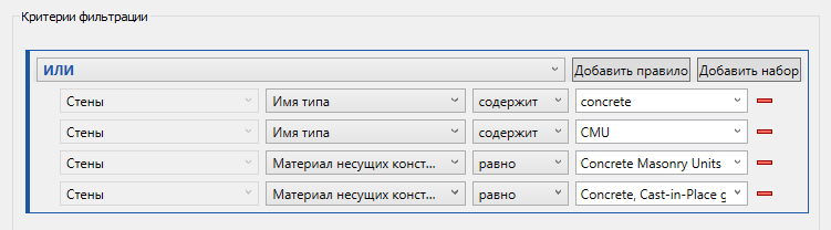 И (Имя типа содержит concrete ИЛИ Имя типа содержит CMU ИЛИ Материал несущих конструкций = Concrete Masonry Units ИЛИ Материал несущих конструкций = Concrete, Cast-in-Place gray)