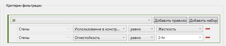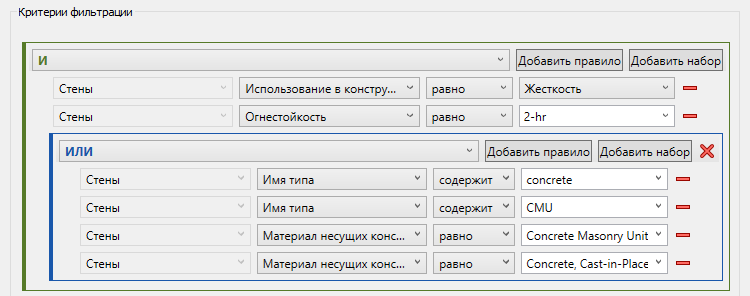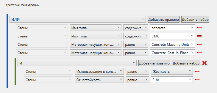 В этом случае, чтобы найти все диафрагмы жесткости в модели, изготовленные из бетона и обладающие 2-часовой огнестойкостью, необходимо начать с набора правил И, вложив туда набор правил ИЛИ, как показано далее.