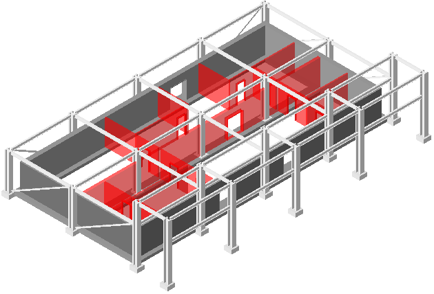 На приведенных ниже изображениях показан вид, для которого фильтр стадий настроен таким образом, что существующие элементы отображаются черными сплошными линиями, а снесенные элементы отображаются красными штриховыми линиями.