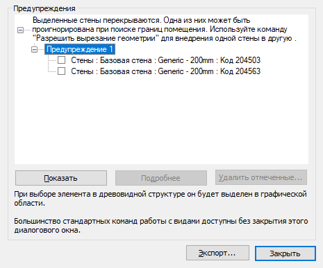 Для просмотра отдельных элементов, связанных с каждым предупреждением, разверните список. При выборе текста рядом с предупреждением соответствующий элемент выделяется во всех видах, в которых от отображается.