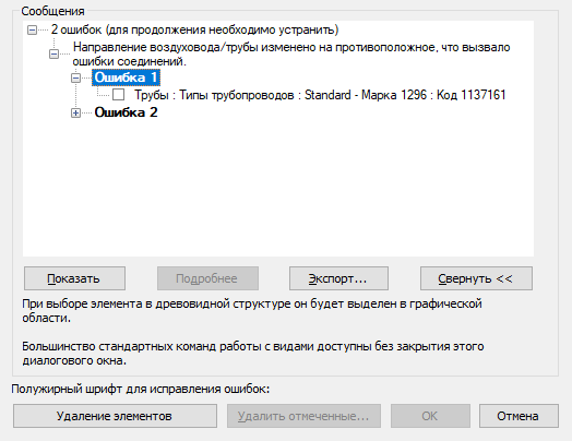 В диалоговом окне ошибки нажмите кнопку "Развернуть" для просмотра древовидной структуры с перечнем ошибок и предупреждений, связанных с последним действием.