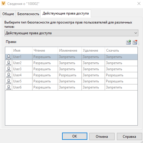 - Выберите вкладку "Действующие права доступа", чтобы просмотреть права пользователя для этого объекта.