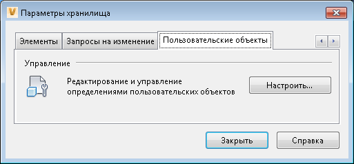 Администраторы могут создавать, редактировать и удалять определения пользовательских объектов. Откройте параметры управления пользовательскими объектами, щелкнув "Настройка" на вкладке "Пользовательские объекты" диалогового окна "Параметры хранилища".