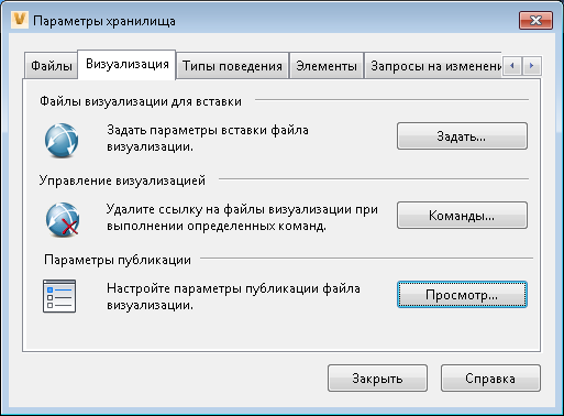 Настройка вставленных файлов визуализации, управление файлами визуализации и настройка параметров публикации на вкладке "Визуализация" диалогового окна "Параметры хранилища".