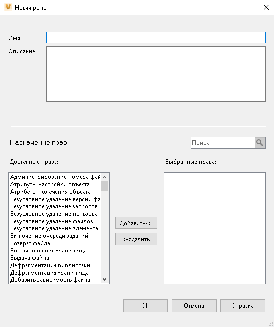 Создание ролей и управление ими осуществляется в диалоговом окне управления ролями. Назначенные для роли права можно просмотреть при создании, копировании или редактировании роли.