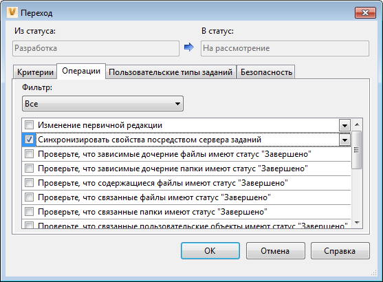 - Установите флажок Синхронизировать свойства и обновить виды посредством сервера заданий в списке «Доступные действия».
