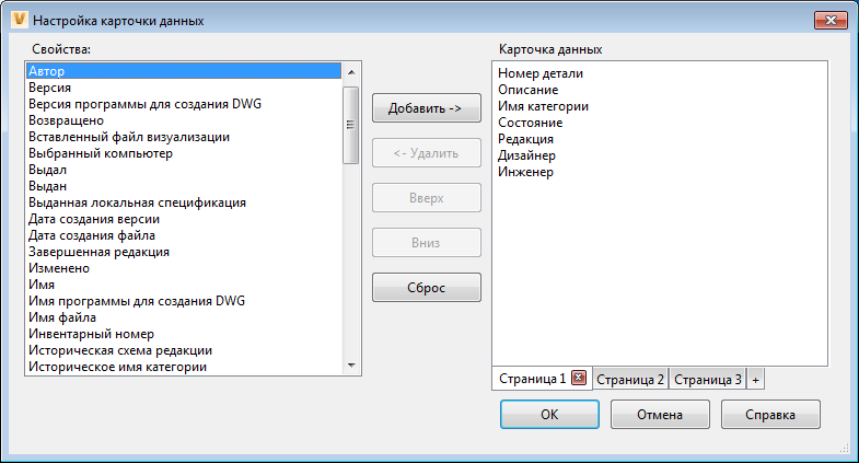 Администратор может осуществлять управление вкладками и определять свойства, которые пользователь САПР может изменять в диалоговом окне "Настройка карточки данных". Список свойств содержит все свойства, которые можно добавить на выбранную вкладку. Свойство добавляется на вкладку только один раз. При этом одно и то же свойство может присутствовать на различных вкладках.