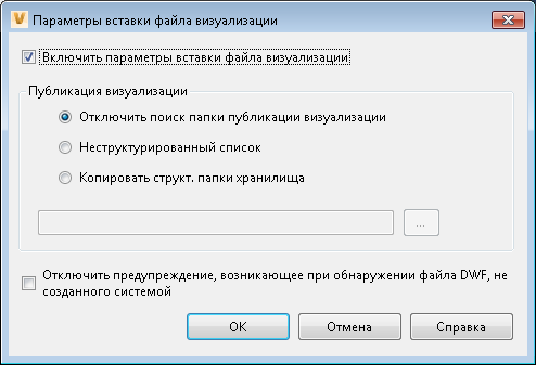 В диалоговом окне "Параметры вложения визуализации" можно включить или отключить вложения файла, указать место публикации вложения визуализации, а также включить или отключить предупреждения DWF.