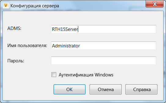 "Управление". Установите флажок "Проверка подлинности Windows", чтобы использовать учетные данные Windows.