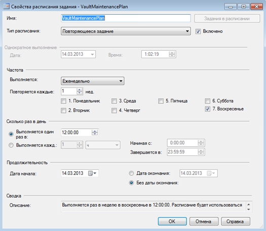 - В диалоговом окне "Свойства расписания задания" настройте, чтобы план выполнялся после завершения резервного копирования Autodesk Vault Server Console. В зависимости от размера набора данных это расписание может быть запущено в другой день и время. Задание можно запустить в субботу, чтобы определить время, которое требуется для выполнения, а затем выбрать наилучший день и время для регулярного выполнения этого задания.