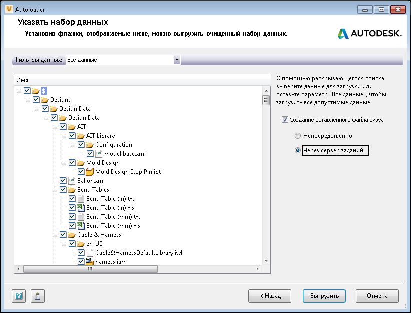 Для использования сервера заданий в инструменте Autoloader выберите параметр "Создать вложение визуализации", затем выберите переключатель "Через сервер заданий" на экране "Указать набор данных".