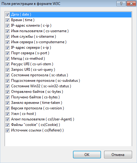 Расширенный формат файла журнала W3C используется по умолчанию для служб IIS. Это настраиваемый текстовый формат на базе ASCII. С помощью диспетчера IIS можно выбрать поля, которые требуется включить в файл журнала.