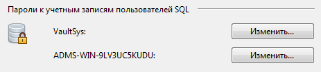 Если установлена программа Vault, по умолчанию предоставляются пароли для учетных записей служб SQL VaultSys и ADMS_%имя сайта%. Администратор может изменять пароли для обеспечения дополнительной безопасности.