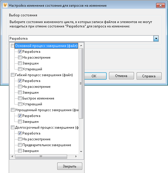 Исключение возможности выхода запроса на изменение из состояния разработки до тех пор, пока записи элементов и файлов запроса на изменение будут находиться в выбранных состояниях жизненного цикла.