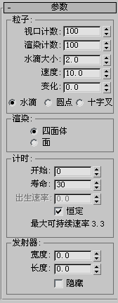 - 在视口中拖动以创建发射器时,即隐性设置了这两个参数的初始值。可以在卷展栏中调整这些值。