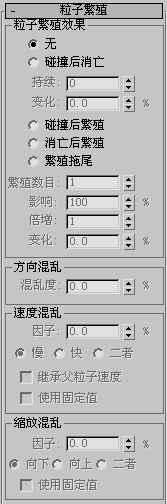“粒子繁殖”卷展栏上的选项可以指定粒子消亡时或粒子与粒子导向器碰撞时,粒子会发生的情况。使用此卷展栏上的选项可以使粒子在碰撞或消亡时繁殖其他粒子。