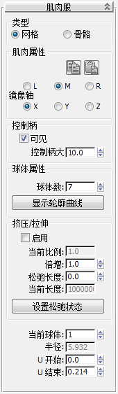 3. 根据需要设置肌肉股的参数。特别是,如果肌肉在蒙皮修改器中使用,则将“类型”设置为“骨骼”;如果计划在蒙皮包裹中使用,则将“类型”设置为“网格”。