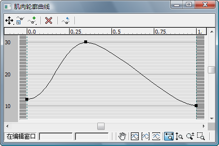 打开“肌肉轮廓曲线”对话框,其中包含一个图形,编辑该图形可控制肌肉股的剖面或轮廓。默认情况下,肌肉的中间较厚,两端较薄,但您可以通过移动曲线上的三个点(不能为该曲线添加点)更改此设置。