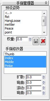 当您可以直接变换手指(手指或足趾)时,您可能更喜欢使用手指或足趾管理器。通过该管理器的控件,您能够编辑选定手指的展开、弯曲、滚动和卷曲程度。手指或足趾管理器还包含内置的手指或足趾姿势预设管理器。