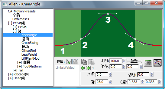 行走循环可以分为四个膝部角度。在 KneeAngle 控制器中可以对膝部角度进行控制,该控制器位于 CATMotion 编辑器的“腿”下方。