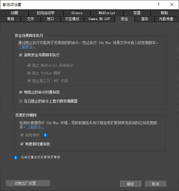 “恶意软件删除”功能可以从场景文件和启动脚本中检测并删除已知恶意脚本。“安全场景脚本执行”阻止新的和已知的恶意脚本,“恶意软件删除”则不仅阻止而且删除已知的恶意脚本。这样可以防止将恶意代码传播给可能未启用“安全场景脚本执行”的其他用户。“恶意软件删除”功能由场景安全工具插件提供支持,Autodesk 发现新的恶意脚本后将更新该插件。