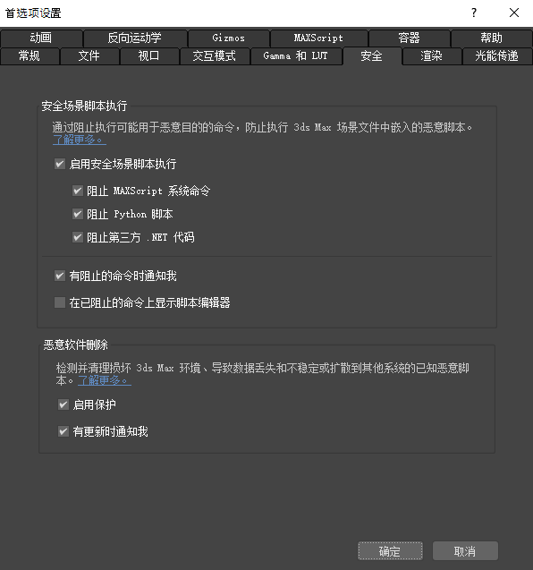 在“首选项设置”对话框的“安全”面板上,设置“安全场景脚本执行”的选项。