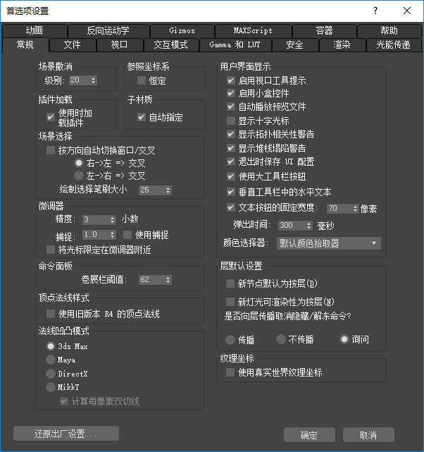 相关的选项。这些选项包括在线框视口中显示的已设置动画的对象、声音插件的指定和控制器默认值。
