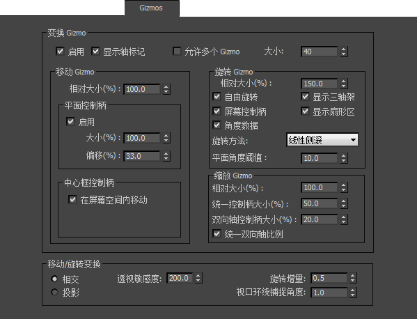 - 设置移动 Gizmo 的大小,相对于变换 gizmo 的大小值。范围为 0.0 至 500.0。