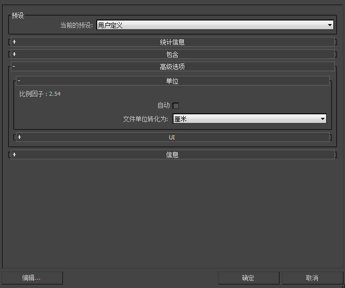如果希望 3ds Max FBX plug-in自动识别、设置并转化传入文件的单位以与主机应用程序的单位匹配,请激活“自动”选项。