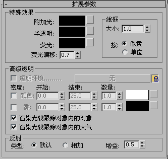 光线跟踪材质的“扩展参数”卷展栏控制材质的特殊效果,透明度属性,以及高级反射率。