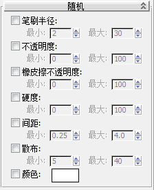 启用此选项后,每次应用笔刷时(包括连续的笔划内)在“最小”和“最大”值之间随机化笔刷半径。不使用“笔刷设置”