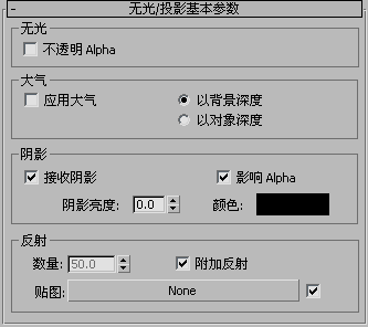 - 在“无光/投影基本参数”卷展栏,禁用“不透明 Alpha”,启用“接收阴影”和“影响 Alpha”。
