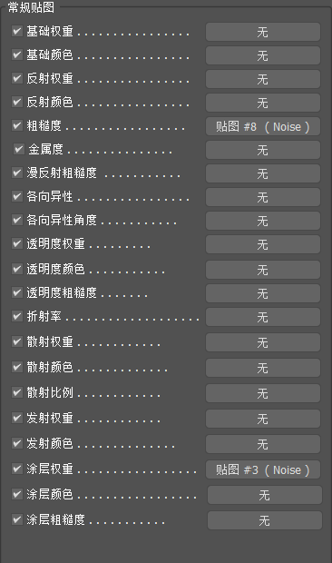 此卷展栏可用于将贴图或明暗器指定给许多“物理材质”参数。您还可以在首先显示参数的卷展栏上指定贴图和明暗器。此参数具有切换,因此您可以使用复选框启用或禁用明暗器,而无需移除贴图。