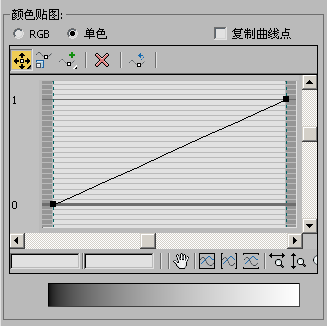 使用“颜色贴图”的图允许对图象的色调范围进行调整。1,1 点控制高光,0.5,0.5 点控制中间影调,而 0,0 点控制阴影。
