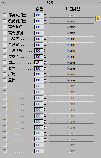 材质的“贴图”卷展栏用于访问并为材质的各个组件指定贴图。它还方便您设置每个贴图的“数量”值(相对强度)。
