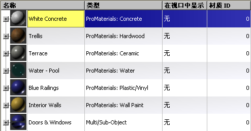 “材质资源管理器”上部的“场景”面板的主窗口可以包含多个列,这些列中包含有关场景中材质的信息。有些类型的列包含可编辑单元。